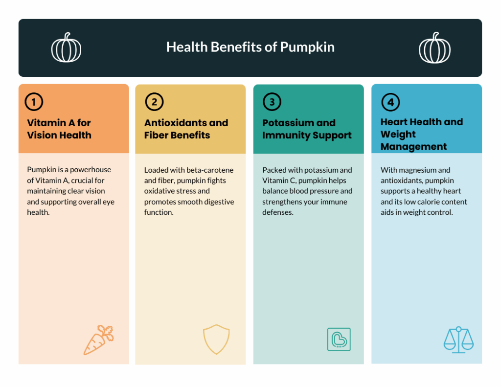 First, let’s talk about the health benefits. Pumpkin is packed with good things. It’s full of fiber, which keeps everything ahem running smoothly. It’s got beta-carotene, which is what gives it that deep orange color, and that turns into Vitamin A in your body. That’s great for your eyes and your immune system.