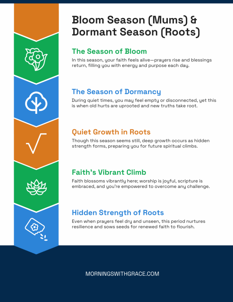 • The Season of Bloom (The Mums): This is when your faith feels easy. You are worshiping, reading your Bible every morning, and your prayers feel like they are hitting the ceiling and bouncing right back as answered blessings. You feel vibrant, useful, and ready to climb any mountain. This is a gift! But it’s not the only season.